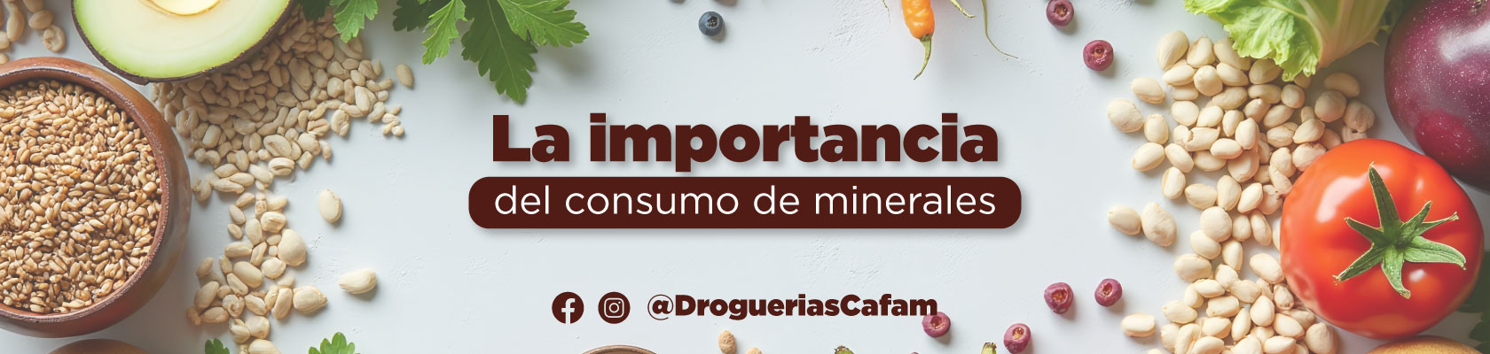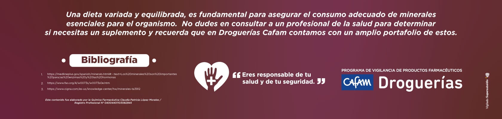 Una dieta variada y equilibrada, es fundamental para asegurar el consumo adecuado de minerales esenciales para el organismo. No dudes en consultar a un profesional de la salud para determinar si necesitas un suplemento y recuerda que en Droguerías Cafam contamos con un amplio portafolio de estos.