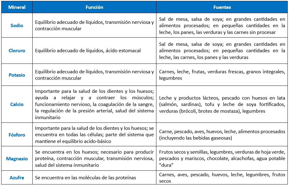 A continuación, te mostramos una lista de macrominerales y microminerales (oligoelementos), sus funciones y los alimentos que los contienen: