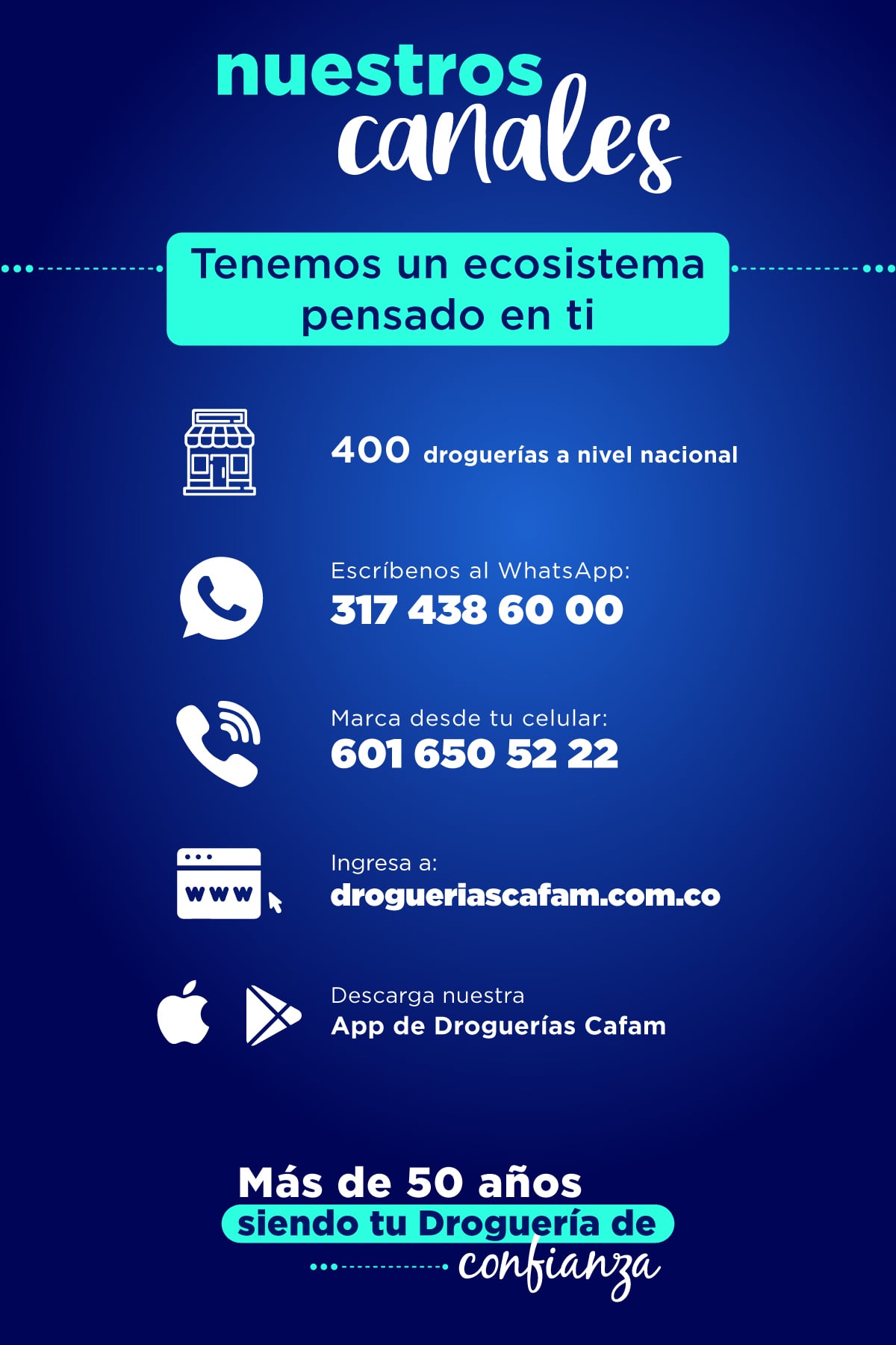 Somos la farmacia online del ahorro y la rebaja en los productos que necesitas. Recuerda que en droguerías Cafam puedes comprar tus productos de forma virtual, a domicilio, con comodidad y economía recibiendolos a domicilio en la puerta de tu casa u oficina. Sin costo adicional comunícate con nosotros a las líneas telefónicas en: Bogotá (24 horas) (1)650 5222 Medellin (24horas) (4)604 0570 Barranquilla (5)385 2333 Bucaramanga (7)697 6777 Cali (2)485 4777 Cartagena (5)694 5222 Manizales (6)896 2205 Cali (2)485 4777 Pereira (6)340 2444 Rionegro (4)604 0570 Santa Marta (5)436 8111 Montería (4)789 8888 Valledupar (5)589 8680. Línea de Atención a Nivel Nacional 01 8000 128 444 o a través de nuestras páginas web www.drogueriascafam.com.co y www.cafam.com.co/droguerías/